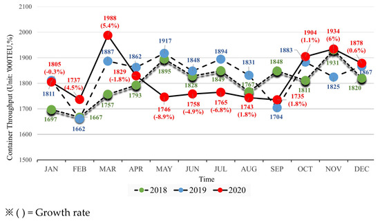 Busan port’s monthly throughput for the past three years (2018–2020). Source: authors’ compilation adapted from 2020 container statistics of Busan port.