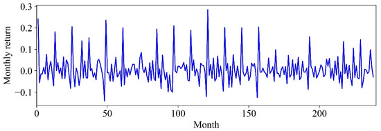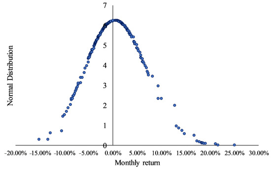 where pt and pt−1 are container throughput in month t and t − 1, respectively; is the mean (average) of monthly returns; and is the length of the time interval set with n data points. Volatility often refers to the amount of uncertainty or risk related to the degree of changes in container throughput. In most cases, the higher the volatility, the riskier the port operations. Using throughput data available in the port management information system (or Korean PORT-MIS), the monthly return of Busan port throughput is illustrated in Figure 4; the monthly volatility is around 6.38%. The empirical results showed that the annual throughput volatility tends to dramatically increase by extending the investigation to the long-term volatility, and the container volume significantly increased from 2001 to 2020; thus, the annual return is very high, accounting for approximately 98.86%. A normal distribution tends to have data points that are close to the mean, as illustrated in Figure 5. The standard deviation is 6.38%, indicating how far throughput returns tend to deviate from the mean when compared with a large deviation from it. Small differences between monthly returns and the mean occur more frequently than large deviations from it, and the standard deviation is less than twice that amount. In order to assist decision-makers in evaluating the underlying mechanisms, as well as predicting the volatility trend, typical dynamical analysis methods were used, as detailed in the following sections.