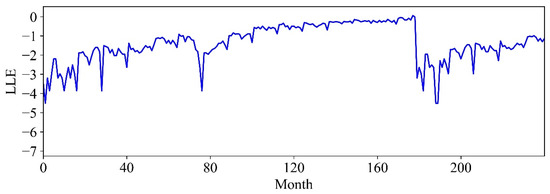 There is a typical order of largest to smallest [62], in which pi(t) is the length of the ellipsoidal principal axis at time t. Chaos occurs if there is at least one positive LE, or if the largest LE (LLE) exceeds one; otherwise, the system may be stable, periodic, or quasi-periodic [61]. According to this method, the LLE of the port throughput system is plotted in Figure 6. According to the theory formulated in [62], it can be seen that LLE is negative for time series, in which the container throughput behaviour is stable. However, the test results illustrate that the LLE varies greatly at some points in the time series, occurring immediately after external shocks. Due to many doubts about the drastic changes in LLE, the occurrence of large fluctuations in the port system needs to be clarified further. However, deriving the LLE from experimental data is much more difficult. Thus, finding a value for LLE may not be very useful, and the value obtained is usually not very accurate. It is consistent with previous studies that Lyapunov exponents failed to detect some drastic changes within the system. This requires alternative algorithms that are more robust than LE to be able to detect system-specific properties [63]. Therefore, other analytical methods need to be performed to verify the dynamical behaviours of port throughput under the impact of disruptions.