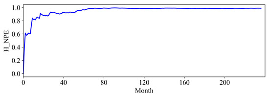 In addition, the entropy value is measured between 0 and 1. The smaller value offers more periodicity and regularity in the time series. To investigate the resilience strategy of the port throughput system mentioned in Section 3.1, the PE method is also applied to clarify the dynamic behaviour of the throughput trend. In the dataset, the numbers of training and test samples are 192 and 48 data points, respectively, where the data length N is given as 240. As illustrated in Figure 7, the basic properties of entropy can be described by the port throughput. First, it is a concave function, and the entropy value is 0 when t = 0, because the variable is not random. In the next period, spiked to 0.6 when t = 5, and then moved mostly sideways for the next few cycles before continuing to rise sharply. From t = 75, the PE hit a value of 1 and retained that pattern until the end of the period. The test results can be explained by exploring the operating history of Busan port. The internal factors are always changing depending on such as operating procedures, management policies, and constantly changing infrastructure, which make the trend of the container throughput fluctuate greatly. In addition, external shocks disturb the port operations, especially complex disruptions such as the financial crisis and the COVID-19 pandemic. Thus, information entropy can be said to be a measure of the systematic ordering degree or randomness of the time series. Through the entropy analysis, the port throughput of Busan port shows complex dynamic behaviour.