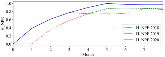 Next, the permutation entropy was used to investigate the port performance over a 3-year time period (2018–2020), and the short-term results are illustrated in Figure 8. At the beginning of the examination, reached a low value every year. However, towards the end of the period, increased significantly and approached for 2020, whereas these values were relatively low in 2018 and 2019. The higher value in 2020 is explained below. Under the impact of the COVID-19 pandemic, Busan port has been facing various challenges in cargo handling activities and shipment services, affecting the dynamic behaviour of seaport operations. With the entropy analysis and its resulting explanation, it can be seen that the throughput system of Busan port exhibits a highly complex, nonstationary, and high level of randomness, especially in 2020 (a period of great disruption and recovery).