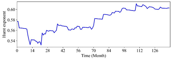 In Figure 9, the Hurst exponent is illustrated for a sliding window of length 140. Overall, there is a significant difference between 0.5 and the Hurst exponent in Busan port’s container throughput, which indicates that loading and unloading operations have a distinct long-term memory effect on container volume. The dynamic features demonstrate the following: (1) The port throughput volume is not only affected by the shipping market with external disruption, but is also influenced by past and present throughput volumes; (2) The Hurst exponent is higher than 0.5 under long time series with many environmental shocks such as financial or pandemic crises, which indicates that the trending pattern on the throughput volume is strong and the trend will continue in the port operation system [60]. If the volume of container throughput is lower than the average volume of throughput at a certain time period, it means that the throughput tends to be lower at the next time point, whereas if the container throughput is higher than average, it means that the volume of container throughput tends to be higher over time; (3) The port authority and decision-makers of the port operation system could combine the previous interevent time distribution with the present situation and use analytical and statistical methods to improve the operation and management efficiency for port productivity.