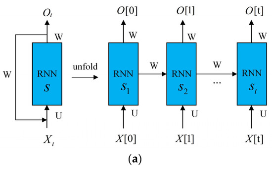 In artificial recurrent neural networks (RNNs), LSTM networks are among the most popular [29,69,70,71]. In time series analyses, RNNs are excellent because they consider the relationship between previous and subsequent data. As with normal neural networks, RNNs are trained by backpropagation and then learn by gradient descent [27]. Recurrent neural networks recirculate input data according to layers, in contrast to normal neural networks. In this way, new information is added to the memory and past information is remembered. A generic RNN architecture is shown in Figure 10a: X[0], X[1]…X[t] are the data inputs, and O[0], O[1]…O[t] are the data outputs, where t is the time or order for each vector [51].