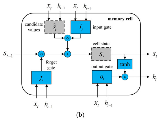 There are three basic layers in LSTM networks: an input layer, one or more hidden layers, and an output layer. Feature space (explanatory variables) is equal to the number of neurons in the input layer. In the hidden layer(s) of LSTM networks, memory cells play a key role in describing their characteristics [51]. Figure 10b illustrates the structure of a memory cell. LSTM layer memory cells are updated at every time step t according to the equations below. The notations used here are as follows: