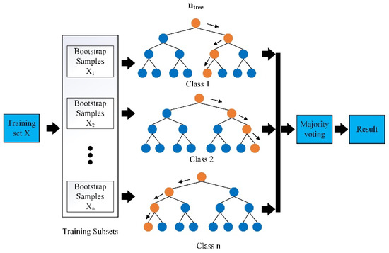 In decision tree modelling, the random forest (RF) algorithm is based on an ensemble classifier. A bootstrap sampling approach is used to generate n training data subsets from an original dataset. These subsets are then trained to build n decision trees [72]. A combination of decision trees is used in the RF algorithm to overcome this shortcoming. When multiple trees are combined, the average of multiple trees will produce the correct results, eliminating the instability of a single tree [72,73]. The final classification result is determined based on the votes for each sample of the testing dataset (Figure 11). Throughput forecasts are performed using RF, with explanatory variables as input variables and residuals from stage 1 as dependent variables [27]. The proposed tasks would be easier to solve with multiple regression; however, RF is superior in accuracy and has wide applicability, including in retail management [27,54], financial management [29], and supply chain management [31]. Furthermore, recent empirical evaluations of the RF strategy demonstrate competitive forecasting performance. Due to the large number of trees, it is computationally expensive.
