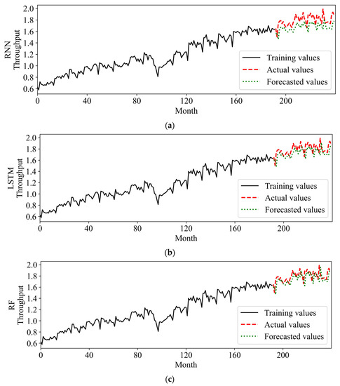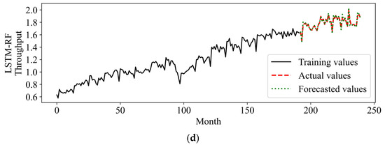 Next, a robust forecasting method has been proposed by combining LSTM and RF to draw on the strengths of each strategy while avoiding their weaknesses. Then, the forecasting performance was extensively evaluated for the proposed hybrid method and a set of well-known algorithms, including RNN, LSTM, and RF. The performance evaluation metrics used were MSE, MAE, MAPE, RMSE, and RMSLE. Furthermore, the DM and HLN statistical significance tests were used to demonstrate the proposed empirical findings. All the evaluation results indicated that the proposed method outperformed all benchmarking models used in this study for both long- and short-term prediction. The proposed hybrid algorithm was the top-performing strategy across all measures at a 95% confidence level. The test results confirmed the superiority of the proposed hybrid method for throughput prediction against market volatility. In addition, the prediction results show that this study has many other possible applications in nonlinear time series forecasting and provides a new paradigm for the development of port productivity forecasting.