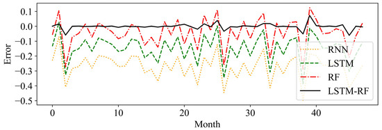 Combining LSTM with RF enables the proposed forecasting method to take advantage of both methods’ complementary strengths, while avoiding overlapping weaknesses. Thus, the proposed method is the hybrid cooperative schemes from steps (1) and (2). In step (1), LSTM acts as the main algorithm to predict the nonlinear time series. In step (2), RF acts as a supervisory algorithm to predict the errors of step (1); then, step (3) can be used for the final forecasting results. These are errors caused by external shocks as well as serious internal uncertainties that LSTM cannot cover. Thus, the complete algorithm works in this way: