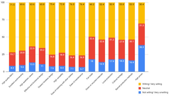 Figure 1 reports the percentage of participants’ responses concerning garment characteristics. The 14 characteristics could be arranged into four main groups in terms of consumers’ willingness to keep the garment for long term use. The first group comprised three characteristics from the design and quality factors of slow fashion: ease of matching, classic/timeless design and ease of maintenance. They were rated most highly by consumers, with over 75% of participants reportedly being very willing or willing to keep a garment with these characteristics for long term use. We compared the means of reported willingness (on a five-point Likert-scale) by a repeated measure ANOVA with a Greenhouse-Geisser correction and found that consumers’ willingness did not differ across these three characteristics, F (2, 1442.79) = 1.25, p = 0.286, ηp2 = 0.002.