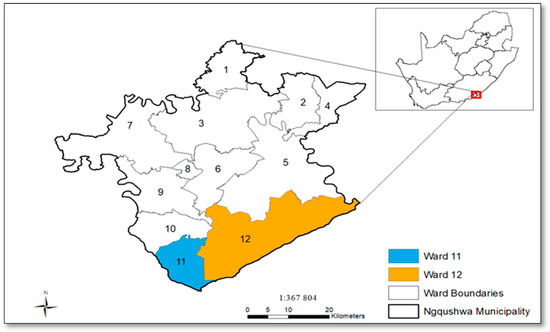 The number 1–12 in this map represent the total wards in Ngqushwa local municipality. The highlighted wards (11 and 12) show the focus area of this study. The study area is indicated on the map of South Africa and the Province inside the box in the right-top corner. The study area is located in the Province of the Eastern Cape within the Amathole district municipality which lies in the southeast of South Africa and borders the Indian Ocean.