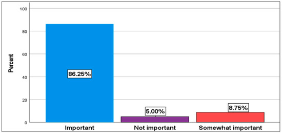 This chart shows the relative proportion of the respondent’s views about the value of the coast to their livelihoods, listed in order from “important” “not important” to “somewhat important”. The majority of the respondents (86.25%) value the importance of the coast, followed by somewhat important (8.75%) and not important (5.00%).
