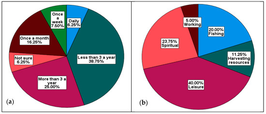Regarding the frequency of visiting the coast, the responses in Figure 4a show that most respondents visit less frequently. Only 6.25% visit the coast more frequently. The fewer visits to the coast might be accredited to the factors such as distance to the coast, costs, and restrained accessibility to some extent. Regarding the purpose and benefits, Figure 4b shows that 83.75% of the respondents visit the coast for three major purposes, that is, leisure, spiritual and fishing. Turpie and Wilson [51] also state that the users of marine resources are divided into three major groups, recreational, subsistence and commercial. Both the purpose and frequency of visiting the coast play an important role in establishing the value communities attach to the coast and the need to improve services.