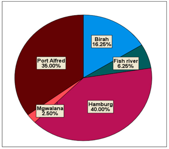 Ngqushwa local municipality (NLM) is situated in the Amathole district municipality in the Eastern Cape province of South Africa. About 66,227 people are living in Ngqushwa municipality [37]. The size of the municipality is approximately 2245 km2 in extent [38]. Approximately, the Ngqushwa coastline constitutes 22% of the Amathole District coastline [39]. Ngqushwa coastal belt is known as the sunshine coast and with six beaches, namely Hamburg, Wesley, Birah, Mgwalana, Mpekweni, and Fish River (see Figure 1). Ngqushwa’s coastal and marine environment comprises inshore and offshore reefs and sandy beaches. A significant proportion of the NLM coastline consists of sandy beaches. Sandy beaches comprise the surf zone, beaches, dune slacks, and dunes up to (but excluding) climax coastal vegetation and are highly productive ecosystems with a great diversity of interacting biota [40]. The coastal land of Ngqushwa still reflects the apartheid image whereby the prime coastal land is dominated by a few white private owners, whereas the black majority is still confined in the areas reserved for blacks by the apartheid government. Both the communities of Amazizi (Mfengu people) and Amaqgunukhwebe (Xhosa group) were dispossessed of their land which was close to the sea through betterment policies of Apartheid [41]. After land dispossession, these communities did not receive just and equitable compensation for their land. The municipal area is predominantly rural with 95% of the population residing in rural areas and only 5% residing in urban areas [38]. Out of 13 wards in Ngqushwa local municipality, there are two coastal wards, that is, wards 11 and 12. About 14.9% population of Ngqushwa reside along the coast [40]. The vast majority of the population in wards 11 and 12 is black (97.8%) and whites form 1.82% followed by coloreds at 0.3%. Most of these coastal communities are inundated with poverty and they depend on marine resources for their livelihood [42].