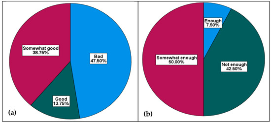 The chart marked (a) shows the respondent’s views about the state of the public roads they use to reach the coastline. The biggest slice (47.50%) represent the view which indicate the bad state of the road followed by somewhat good (38.75%) and good (13.75%). The chart marked (b) shows the respondent’s views about the availability of the parking area at the beaches they visit. As per their views, it appears that the parking at the beach is not enough (42.50%), only (7.50%) think that the parking area at the beach is enough. However, (50.00%) hold the view that the parking area is somewhat enough.