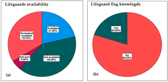 Respondents were asked about safety along the coast. According to Figure 10a, 40.00% of the participants indicated that lifeguards are not available, followed by 33.75% (somewhat available), 21.25% (available) and 5.00% (not sure). However, respondents indicated that lifeguards are mainly available during the peak seasons (festive and Easter) rather than throughout the year. The availability of lifeguards also plays a vital role in the promotion of public coastal access. Communities also raised a lack of visibility of security on all beaches in Ngqushwa’s local municipality. Coastal safety and security are an integral part of coastal management. Lack of safety may deter communities from visiting the coast. Participants were also asked to comment and describe a lifeguard flag (the Yellow–Red flag). As per Figure 10b, about 80.00% of the respondents gave a ‘no’ response and only 20.00% responded ‘yes’. Knowing a lifeguard flag is part of beach safety which should be taken seriously by members of the public. This shows limited knowledge about beach safety. Beach safety is an integral part of access, especially for people who visit the beach for swimming purposes. Similarly, Locknick [52] conducted a study about beach user perceptions at Brackley beach and Cavendish beach on Prince Edward Island and found that awareness about beach safety was unsatisfactory.