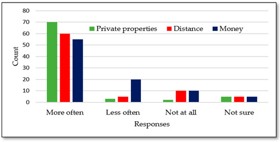 Whilst the findings of this study are situation-specific, consistency with other studies means they can be generalized. For example, in their survey in Nova Scotia, Lura Consulting [54] found that over (75%) of residents use the coast for leisure activities. Over (76%) of the respondents were concerned about public coastal access and (50%) of respondents felt that private property hinders their access to the coast. In their study, Alterman and Pellach [55] also found that blockage of public access to the beach on the California coastline was mainly associated with private gated properties along the coast. Levasseur et al. [56] also discovered that mobility and social participation were both positively associated with proximity to resources and recreational facilities. Similar findings were made in this study; therefore, this study expands on the previous studies by adding specific data which was not discovered before.