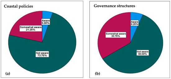 The two charts show respondent’s levels of awareness about two coastal management aspects, that is, knowledge about coastal policies (a) and governance structures that facilitate coastal access (b). In both charts, the bigger slices represent a lack of knowledge about coastal management policies and governance structures. In both charts those who are aware are less than (10%).