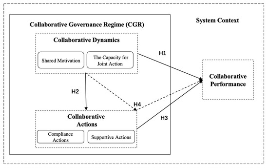 Between collaborative dynamics and collaborative actions: Emerson et al. proposed, in the IFCG model, that collaborative actions are a direct output of collaborative dynamics [11]. Specifically, collaborative actions are more likely to be implemented if there is collaborative consensus among partners and sufficient collaborative dynamics exist. In the model, shared motivation and the capacity for joint action will maintain actions such as open communication and sharing in the system, which will further increase the level of internal mutual support and communication, thus facilitating the implementation of collaborative actions. Thus, there is a positive influence of collaborative dynamics and collaborative actions.