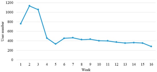 The target population in this study are the lecturers who were responsible for the undergraduate teaching tasks during the autumn semester in 2021. There was a total of 18 academic weeks and more than 5500 undergraduate classes launched in that term. However, due to another round of pandemic risk, the target university, originally scheduled to start the new semester in September, had to close until the crisis eased in the third academic week. Lecturers were forced to deliver courses fully online during the first three weeks. Diverse educational or commercial learning systems were available, and teachers could choose their favorite one for course delivery. The number of teachers who used RC during the first three weeks was 1548, accounting for the largest proportion compared with other technological platforms. At the beginning of week 4, lecturers returned to normal teaching but were permitted to use any of the three teaching approaches mentioned above. At this time, the number of teachers who voluntarily retained platform usage plummeted to 458. The weekly number of users then remained moderately steady until week 16. The last two weeks were reserved for university-wide final examinations, during which teachers did not present lessons. The detailed weekly number of RC users in that semester are shown in Figure 2. The number in the first week was less than that in the second/third week, probably because some teachers were unable to enter their large online classes due to server overload in the first two days and temporarily transferred to other commercial systems for teaching.