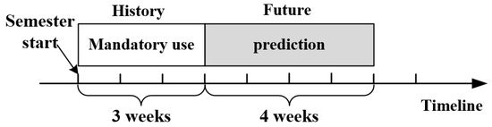 The prediction task of the present study is addressed in the way that copious studies solved SDP. Since each course was launched based on weeks, a time window with a weekly unit for time slice was employed to illustrate the predictive target and features (see Figure 3). The time axis started at the beginning of the semester when course content was delivered wholly online. Features were extracted from the statistics of teachers’ activities related to mandatory use of a technological system during the historical period of the first three weeks. Being a supervised binary classification task, the target had two classes: one was the sustainable case in which a teacher would still perform online activities in the future period, coded as 1; the other was the unsustainable case in which a teacher would not have any online activities in the future period, coded as 0. Nevertheless, the length of the future period for prediction is difficult to decide. If it is too long, then the prediction will be late and the system will be unable to offer prompt intervention; if it is too short, then some engagement records will be excluded and the classification will be inaccurate. Drawing upon the typical way that the problem of SDP was addressed, a duration of four weeks (a month) was determined to judge the targeted class. Thus, the prediction problem in this study can be defined as predicting whether a teacher will retain specific activities in RC in the next consecutive four weeks based on his/her mandatory use behaviors during the historical first three weeks. The number of sustainable cases among the 1548 RC users was 678, accounting for 43.8%.