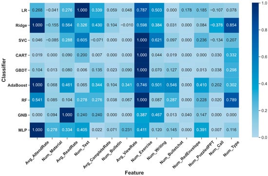 Since feature importance scores derived from different classifiers might significantly vary from each other, an ensemble strategy was adopted to combine the ideas over all comparison models (namely, LR, Ridge, SVC, CART, GBDT, AdaBoost, RF, GNB, and MLP). Thereof, LR, Ridge, and SVC produce directional weight coefficients with sign (+/−) indicating classification (1/0). Thus, pursuing a comprehensive and thorough understanding of lecturers’ online activities, we considered the situation of negative influence and dealt with feature scores in two stages. In the first stage, all feature scores were treated as non-directional, and values only gave an indication of the magnitude of relevance to data separation. For this case, two detailed steps were taken: firstly, normalizing absolute feature scores between 0 and 1 by different classifiers; secondly, averaging the normalized scores of the same feature from all classifiers. Building on the first stage, the second stage focused on features with a negative score yielded by LR, Ridge, and SVC. Considering domain interpretations of features with negative scores, especially the negative high value obtained in the first stage, we could gain more insights into teachers’ online behaviors. Furthermore, in order to prioritize different teachers’ roles in facilitating their sustainable online teaching, scores of the features belonging to the same teacher role were averaged to generate a unique value for ranking them.