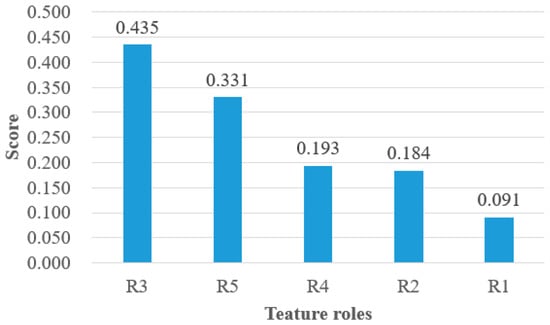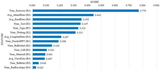 Based on the combined importance scores, Figure 5 presents the ranking of features in descending order, as well as their corresponding teacher roles. Num_Exercise recorded the highest score (0.770), outnumbering the score (0.442) of the second feature Avg_AttendRate. Num_Exercise records the number of in-class quizzes that teachers perform to assess and correct students’ learning acquisition, belonging to learning assessment (R3), whereas Avg_AttendRate involves the activity of monitoring students’ attendance, related to learning support (R4). The following four features have almost equal importance values, pertaining to the roles of R4, R3, R5, and R2, respectively. The subsequent six features recorded lower scores, of which Num_Call, in 10th position, and Num_Material, in 11th position, are both negatively associated with sustainable online teaching. The remaining two features, Num_Bulletin (0.044) and Num_RedEnvelope (0.024), had marks much lower than the others.