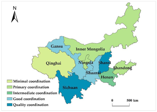 Spatial distribution of CCD between new-type urbanization and TRCE in the Yellow River Basin in 2025.
