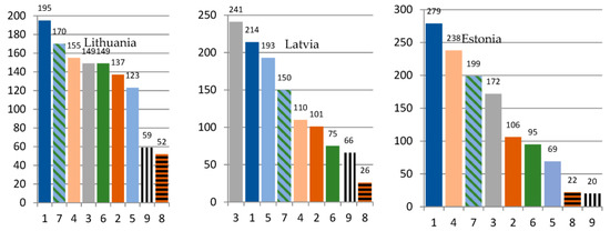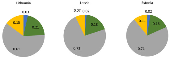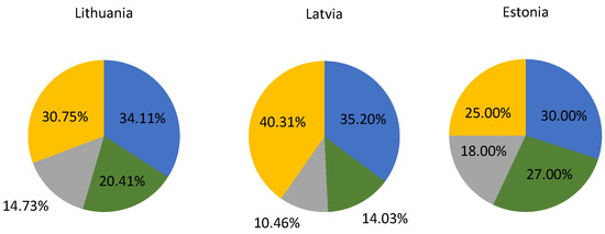 The second block of questions sought to clarify the level of knowledge of respondents’ financial literacy and personal finance management. The two questions were adopted from Lusardi et al. [35]: (1) the inflation effect on savings: “Imagine you are making a deposit with an interest rate of 1% per year and inflation of 2% in the same year. How many of the same goods and services will you be able to buy with the amount of money available in one year?”; and (2) diversification of investments: “By investing in the stock market, the risks of the investment can be reduced by investing in a wide range of shares of different companies”. The results show that in both cases, young people in Estonia have higher financial literacy knowledge compared to young people in Latvia and Lithuania.