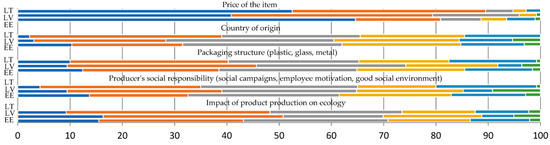 The importance of different factors when selecting a product for respondents in Lithuania (LT), Latvia (LV), and Estonia (EE) as a percent of the total responses. Source: composed by authors. Notes. Colors denote the grades of the Likert scale as follows. Blue means strongly agree; salmon means I agree more than I disagree; grey means neither agree nor disagree; yellow means I disagree more than I agree; sky blue means strongly disagree; green means I cannot answer.