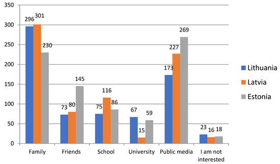 This research also aimed to identify the channels through which young people in the Baltic States acquire financial literacy knowledge and learn to manage their personal finances. The results show that parents and media are the mains sources of information and knowledge (Figure 5).