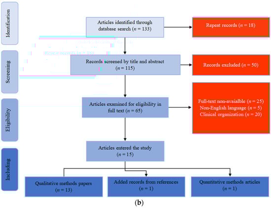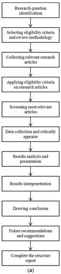The papers included in the review were identified using a method guided by the PRISMA guideline for preferred reporting items for systematic reviews and meta-analyses [66], as demonstrated in Figure 1a,b. The selection criteria for the papers selected were limited to those reviewed in full length between 2010 and 2021.