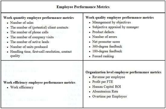 While many businesses continue to make incentive decisions based on unstructured and subjective methods of evaluating performance, there are signs that quantitative performance assessment techniques are becoming more widely used in recent years according to some experts [41,42]. According to Gardner [41], employee performance is defined as the process of evaluating a person’s work to make fair management decisions; also known as employee valuation, it is defined as the process of gathering, analyzing, and documenting information about an employee’s relative contribution to the business [43]. This occurs due to a prearranged meeting between a company’s managers and its employees, during which the former reviews the latter’s performance in the company. In this situation, one of the key objectives is to identify strengths and weaknesses, which will serve as the framework for developing recommendations for efforts to improve organizational effectiveness and efficiency [41].
