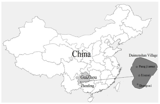 Duimenshan Village, about 20 km from Zhenfeng County and 100 km from Xinyi City, located in Zhenfeng County, Southwest Guizhou Province, China, covering an area of some 33.67 hectares, is a state-level integrated demonstration pilot for rural revitalization. There are 2984 people from 650 households of Han, Buyi, Miao and other ethnic minorities. The “Twelve tunes of Buyi bronze drum”, which is one of the ancient percussion instruments of the Buyi nationality and was approved by the State Council and listed in the first batch of the national intangible cultural heritage list, is preserved here. Duimenshan Village consists of three villager groups, which are, from north to south, Shangzai, Xiazai, and Pangjiawan (Figure 1). The topography is generally low in the north and high in the south and is a typical low-hilly landscape. The altitude of most of the area ranges from about 1294 m to 1370 m. The village enjoys a subtropical humid monsoon climate. The annual average temperature is 16.6 °C. There are 220 frost-free days per year. The annual precipitation is between 1000 and 1400 mm. The local villagers mainly depend on flue-cured tobacco planting and processing for their livelihood. Other plants, such as rice, corn, and coix seed, are occasionally planted. The landscape of Duimenshan Village has changed dramatically since 1958 and has been influenced by the long local history and culture, which is of unique research value.