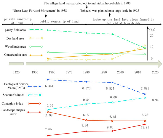 As shown in Figure 6, the landscape changes in Duimenshan Village mainly occurred in the periods from 1958 to 1980 and from 1995 to 2015. Although village land was distributed to individual families in the 1980s, there were no structural changes in people’s production and lifestyle, therefore, this resulted in relatively gentle landscape changes from 1980 to 1995. Paddy fields declined yearly from 1985 and began to show a sharp descending trend from 1995. The forest basically presented a linear downward trend. Construction land showed a linear upward trend. However, the dryland area rapidly increased from 1995, mainly due to the conversion of a large number of paddy fields to dry land because of the large-scale planting of tobacco.
