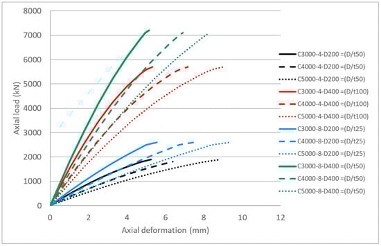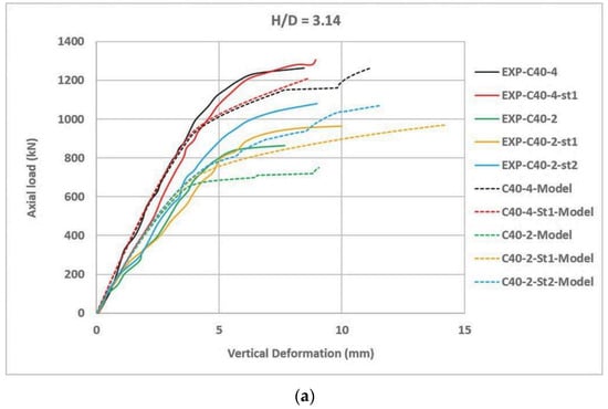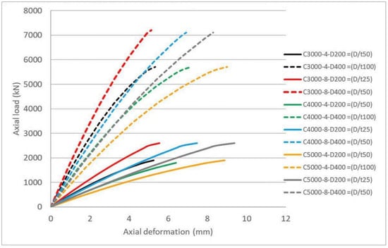 - Increasing the diameter of the CFST columns while maintaining the tube thickness is constant, i.e., D/t is increased, significantly increasing the load-carrying capacity by 2.7–3.00 times as doubling the column diameter but decreasing the vertical deformation due to the increase in column stiffness. These decreases in the vertical deformation is more markable in long columns (H/D > 12) than for the medium (4 < H/D < 12) and short columns (H/D < 4).