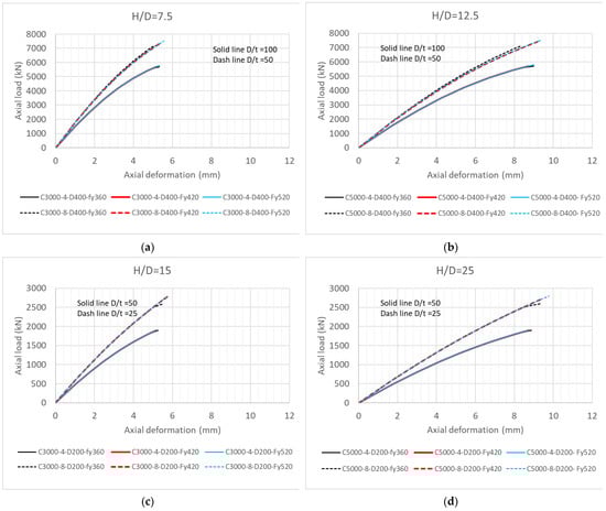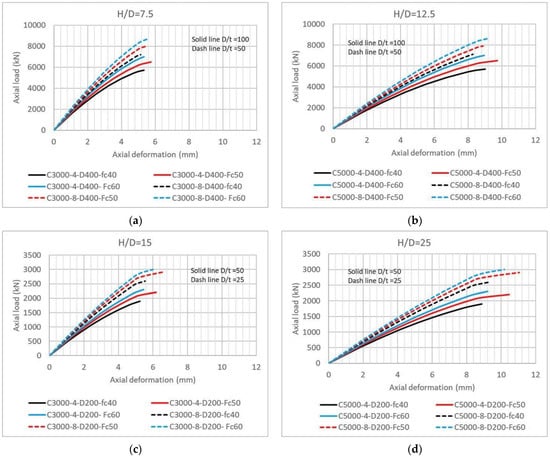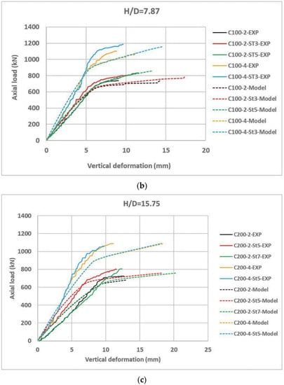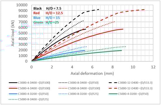 - The vertical deformation increased, but the failure load is not remarkably different when increasing the column height-to-diameter ratio (H/D) while maintaining the column diameter and tube thickness as constants. This is because decreasing the column stiffness by increasing the column height is inversely proportional to the deformation.