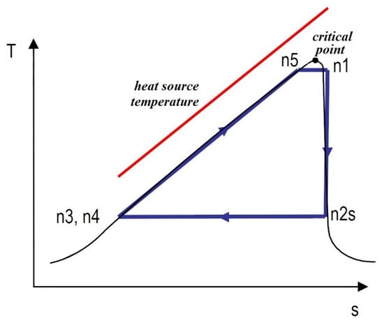 Organic Rankine Cycles (ORC) enable cost-efficient power generation from low-grade heat sources by replacing water with organic working fluids, such as various synthetic refrigerants or natural fluids, e.g., hydrocarbons. ORC systems use low-grade heat from various sources such as biomass, geothermal water, and solar and waste heat of industrial processes. ORC is also regarded as a very suitable method to recover the waste heat of internal combustion engines [1,2,3]. The main differences between the ORC and the conventional Rankine cycle are the working fluid and operating pressures and temperatures. Therefore, the operating performance of an ORC system depends mostly on the properties of the working fluid. However, design and operating characteristics of the cycle are also important. A suitable fluid for an ORC system should have favourable physical, environmental, safety, and economic properties. It is also desirable that working fluid circulating in the ORC system should consume as much heat as possible, which requires a large temperature drop. This can be accomplished by means of a configuration of the system whereby the working fluid is heated using a minimum ratio of latent heat during the evaporation process, i.e., the latent heat should be minimised as much as possible. These conditions are possible in the vicinity of the critical point, as shown in Figure 1.