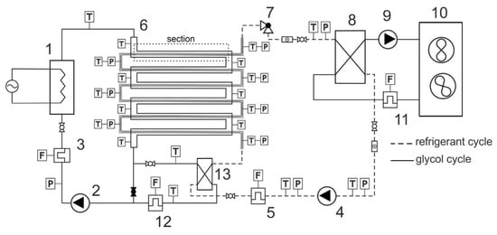 Schematic of the experimental stand: 1—electric heater, 2,9—glycol circulation pump, 3,5,11—mass flow meter, 4—refrigerant circulation pump, 6—test heat transfer section, 7—control valve, 8—condenser, 10—fan cooler, 13—auxiliary heat exchanger.