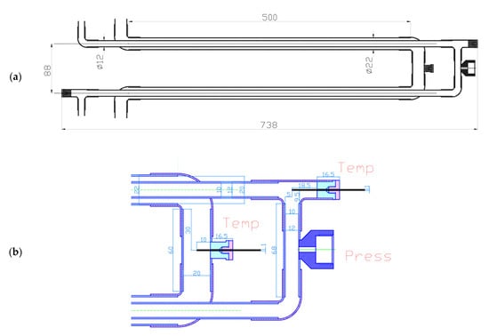The testing stand was equipped with a high-class calibration system for measurement paths, pressure and temperature transducers, and flow meters. All sensors and transducers have been calibrated in accordance with ISO 9000. The calibration of thermocouples used on the tested exchanger is made before each measurement series with an accuracy of ±0.15 K within the range provided for in the tests. Mutual deviations of thermocouples are not greater than ±0.1 K. For the measurements of mass flow rate of glycol and boiling fluid, Endress-Hauser Promass 83 mass flow meters with measurement accuracy of 0.1% for the liquid phase were used. Two kinds of pressure transducers were applied in the testing stand, i.e., Endress + Hauser Cerabar S PMC71 (maximum pressure 40 bar located at the outlet of the liquid pump (see point 2, Figure 2), and the rest were Druck pressure transducers (maximum pressure 40 bar). The DPI-145 calibrator was used to calibrate the pressure measurement path. Taking into account the measurement ranges of the pressure sensors, the calibration was carried out in the pressure range of 3 ÷ 20 bar. During the pressure transducer calibration procedure, after checking the tightness of the system, it was pressurized with nitrogen to an absolute pressure of about 20 bar. The readings of the DPI-145 calibrator were considered as the basis for the calibration procedure. The measurement system recorded the indications of individual transducers. During the measurements, at least 100 samples were taken for each recorded pressure, from which the average value was determined. Reference pressure indications were recorded manually. In the proper tests, the pressure measurement paths will be recalibrated for the values provided in the boiling tests in the near-critical range for the selected working medium. The average accuracy of pressure measurement was ±0.3% of the transducer readings for the entire pressure measurement path. On the basis of the above presented measurement uncertainties, the average measurement error of the heat flux calculated by the total differential method for the test sections for the entire measurement range was approx. 12%.