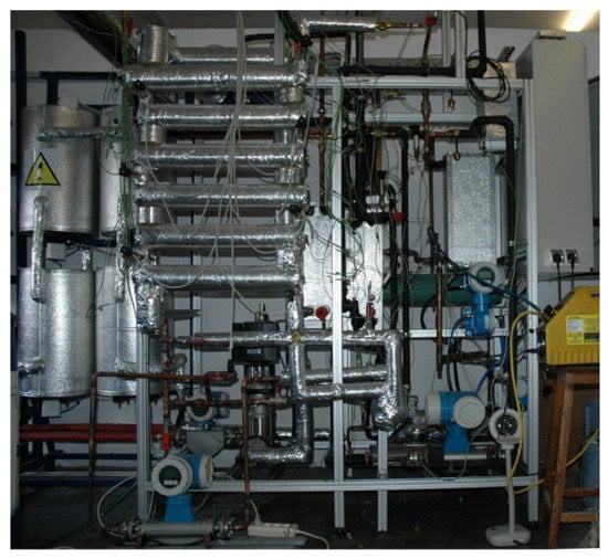 The test facilities were designed and built specially for the purpose of these investigations. The testing loop was modified and instrumented for the refrigerants used as test fluids in order to perform experiments under conditions of high operating pressures. The schematics of the experimental apparatus with the tested heat exchanger applied are shown in Figure 2, and the main components of the stand are listed in the figure description.
