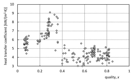 The experimental investigations covered the measurement of the average heat transfer coefficient for isobutane (R600a) and two synthetic fluids, R-134a and R-507A, under conditions of various levels of pressure at the inlet to the tested heat transfer sections. The experiment ran heat flux density 0.6 to 10 kW/m2 and mass velocity 60 to 200 kg/(m2·s). The measurement approach presented in Section 2.2 was applied for each tube-in-tube heat transfer section. Therefore, the obtained results may be thought as a kind of local surface heat transfer coefficient. Local two-phase quality of the two-phase flow was determined on the basis of the energy balance of each tested heat transfer section of the tubular heat exchanger. The test conditions are presented in Table 2. The selected results of the single series for each type of investigated refrigerant are presented in Figure 6, Figure 7 and Figure 8.