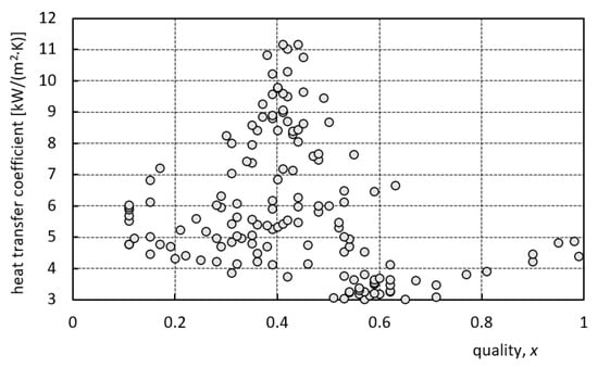 The ratio of the heat transfer coefficient obtained from the above Gungor–Winterton correlation to the experimental values, , is presented in Figure 9.