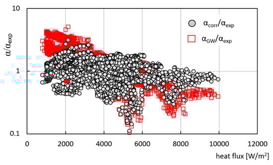 A comparison of the proposed modified heat transfer correlation, Equation (26), with predictions based on the original Gungor–Winterton correlation, Equation (19), and experimental data is presented in Figure 10. The coefficient of determination for the entire experimental data for the proposed heat transfer correlation is R2 = 0.51. The proposed correction significantly improves the prediction of the heat transfer coefficient for the lowest and highest heat flux densities.