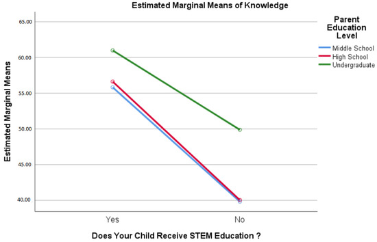It can be seen that parents’ STEM awareness does not differ significantly based on the interaction between the child’s education level variable and the child’s STEM education variable (λ = 0.995, F(3.386) = 0.601, p = 0.61, p > 0.01). The parents’ STEM awareness does not differ significantly based on the interaction between the child’s education level variable and the parent’s education level variable (λ = 0.977, F(6.772) = 1.509, p = 0.17, p > 0.01). The parents’ STEM awareness does not differ significantly based on the interaction between the child’s STEM education variable and the parent’s education level variable (λ = 0.979, F(6.772) = 1.405, p = 0.21, p > 0.01). The parents’ STEM awareness does not differ significantly based on the interaction between the child’s education level variable, the child’s STEM education variable, and the parents’ education level variable (λ = 0.980, F(6.772) = 1.333, p = 0.24, p > 0.01).