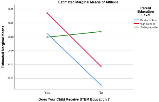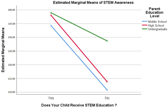 Figure 2 shows a significant difference in the STEM awareness of parents with a middle school education between those parents whose children received STEM education and those who did not, based on whether their children received STEM education [t151 = 6.387; p = 0.000, p < 0.001]. A significant difference was found in the STEM awareness of parents with a high school education between those whose children received STEM education and those who did not [t133 = 6.918; p = 0.000, p < 0.001]. A significant difference was found in the STEM awareness of parents with an undergraduate education between those whose children received STEM education and those who did not [t110 = 3.917; p = 0.000, p < 0.001]. When checked to see whether the significant difference based on the parents’ education levels was in favor of the children who received STEM education or not, children who received STEM education favored parents’ STEM awareness at all education levels, middle, high school, and undergraduate.