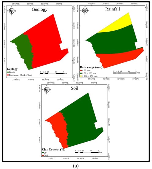 Rainfall amount varies in the Wadi Hammad basin from lower than 50 mm/year in the southeastern parts of the basin to 150 mm/year in its northwestern and northeastern parts (Figure 2a). In general, the percentage of clay in the soil of this basin shows extremely low variations; it amounts to 20.0% in its eastern and southeastern parts and 20.5% in the southeast and northeastern parts (Figure 2a).