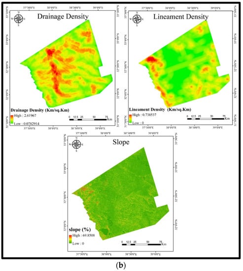 (a): The physical characteristics of the study area (soil, rainfall, and geology). (b): The physical characteristics of the study area (drainage density, lineament density, and slope).