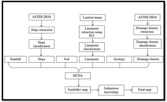 A Multi-Criteria Decision Analysis (MCDA) was employed in the Geographic Information System (GIS) environment by researchers for the selection of the optimum locations for water harvesting (e.g., Elewa et al. [], Al-Khuzaie et al. [], Sayl et al. [], Srivalli and Singh [], Adham et al. [], Al-Adamat et al. [,], Al-shabeeb [], Bakir and Xingnan [], and Gupta et al. []). In most of these studies, the variables used to identify the sites with high potential for water harvesting were rainfall volume, slope, soil texture, site geology, drainage density, and lineament density. The viability of integrating indigenous knowledge with geoinformatics to determine the most suitable sites for water harvesting has been investigated by several researchers, including Elewa et al. [], Al-shabeeb [], Al-Adamat et al. [], Izugbara et al. [], Oweis et al. [], Eastman [], Vorhauer and Hamlett [], and Gonzalez []).