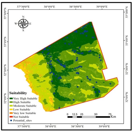 For the analysis of data in an effort to locate the optimum locations for water harvesting, this study followed the approach to data analysis that was used by Elewa et al. [], Al-shabeeb [], Smerdon et al. [], and Gonzalez []. All variables under consideration were assigned equal weights and binary coding in which 1 denotes a suitable site for water harvesting and 0 points to a non-suitable site. This approach differs from the approach followed by Shatnawi [], Al-shabeeb [], and Al-Adamat et al. [], who employed the Weighted Linear Combination (WLC) method owing to the fact that weighting is a highly sophisticated process, and it may produce misleading outcomes. Al-Adamat et al. [] pinpointed that interpreting weights as a general indicator of importance is misleading. The incorrect allocation of weights is a particularly popular error in applying the WLC method to spatial problems [,].