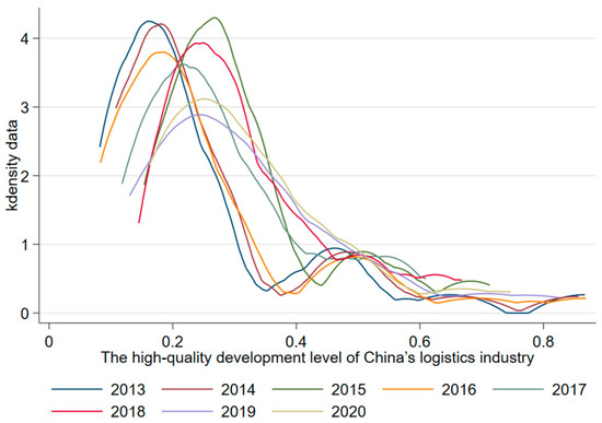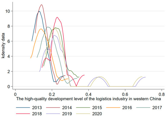 Using the aforementioned kernel-density approach, this research studied the dynamic evolution process of high-quality growth of China’s regional logistics business (see Figure 1, Figure 2, Figure 3 and Figure 4). In Figure 1, it can be seen that the position of the main peak of the distribution curve shifted to the right over time, indicating that the high-quality growth level of China’s logistics industry was generally on the rise, whereas the height of the main peak tended to decrease and the width tended to increase, indicating that the regional difference tended to decrease, and there were small peaks, showing a peak pattern of “one main and one small,” indicating that the high-quality growth level of China’s logistics industry polarized during the sample observation period.
