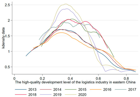 - The regional logistics industry’s high-quality development level and dynamic evolution process were measured and a high-quality development index system for the industry was built. The main conclusions show that most of the provinces in China effectively improved the high-quality development level of the logistics industry during the sample observation period. Most of the provinces with a relatively high level of high-quality development of the logistics industry belonged to the eastern region and most provinces with a relatively lower level of growth belonged to the western region. These findings are consistent with the results of the previous study. There was a positive correlation between logistics and economic growth, and the level of economic development determined the development level of the logistics industry to a certain extent [25,26]. Observation from the dynamic evolution process: The difference in the high-quality development level of China’s logistics industry tended to decrease and appeared to be polarized during the sample observation period. Sub-regional observation: The data in the east and west were relatively centralized and there was no polarization phenomenon, indicating that the development of different provinces in the region was relatively coordinated. The difference in the central region was also increasing and there was an obvious polarization phenomenon. On the other hand, the data in the central region were highly dispersed, indicating that the horizontal distribution in the central region was uneven and the internal difference was large. However, it can be seen from the distribution range that the wave crest in the eastern region was concentrated within 0.4, but 0.4 was the extreme value in the central region, whereas in the western region it was concentrated between 0.1 and 0.2. The overall level was the lowest among the three regions, but the level in the western region tended to increase. This may be due to the good location of the eastern region. The advantages, regional economic development, and infrastructure construction level were better, making the development of the eastern region higher than that of the other regions. To sum up, there were apparent differences in the high-quality level and evolution dynamics of logistics in the three regions, and it was found that the development of the logistics industry and regional economy were interrelated, which generally showed the unbalanced status of “high in the east and low in the west” [27].